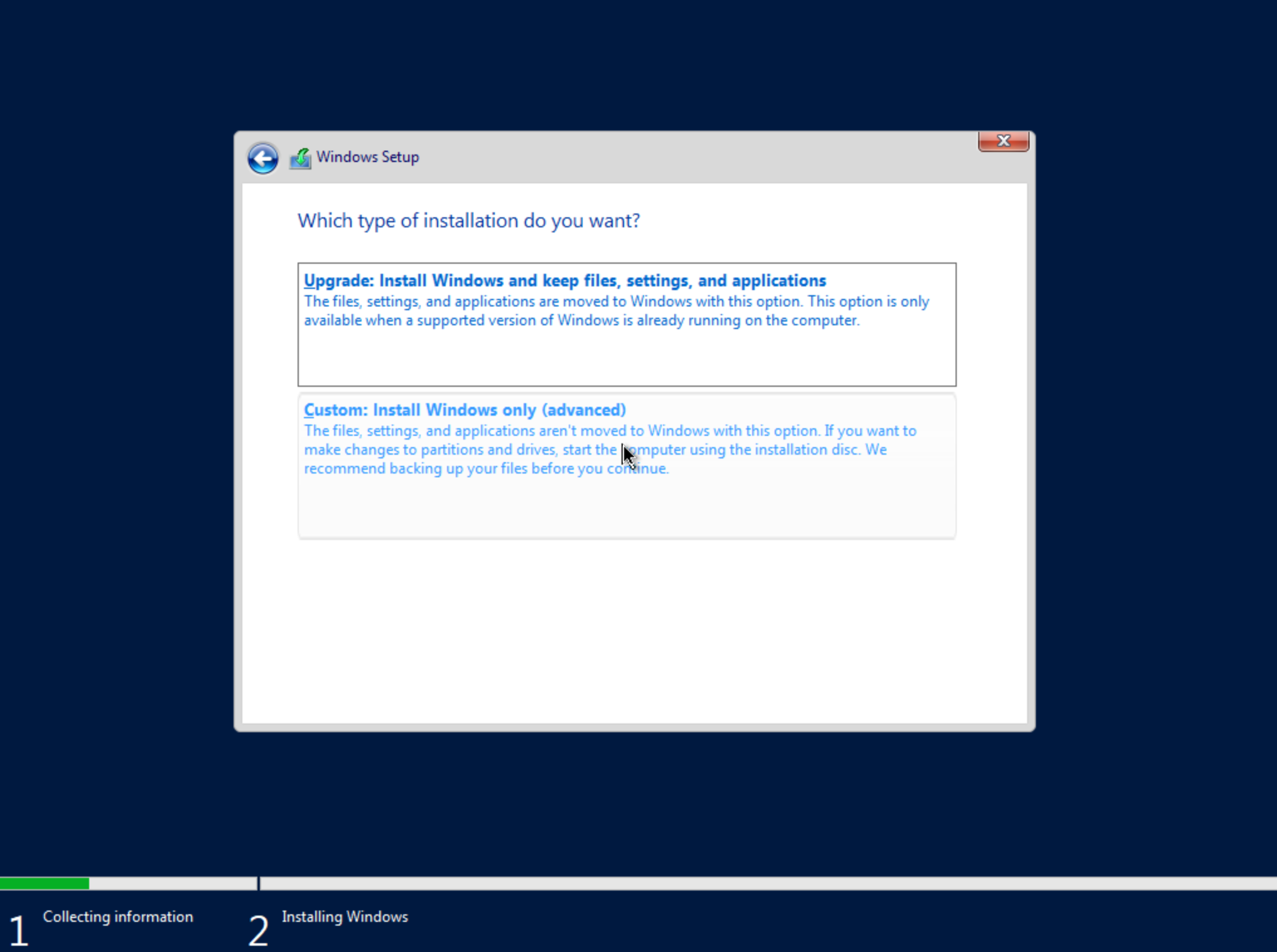 After a moment, we’re back at the screen asking where Windows should be installed. We should see the disk(s) of size and type selected at the time the VM was provisioned. Select the proper disk and click “Next.” The Windows installation will now begin. Once Windows has fully installed, proceed to the next step.