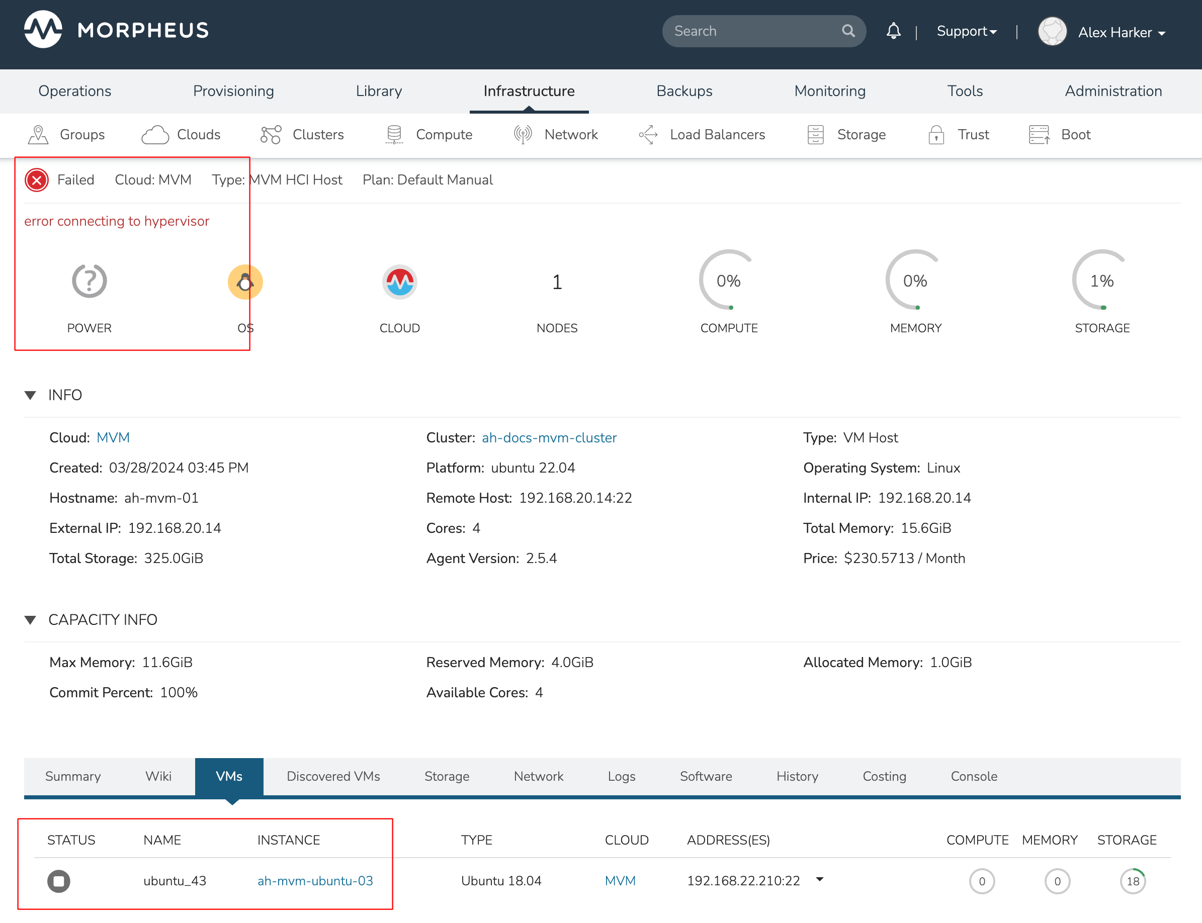 With the server provisioned and a workload running, take a look at the monitoring and actions capabilities on the cluster detail page (Infrastructure > Clusters, then click on the new HPE VME cluster). View cluster performance and resource usage (Summary and Monitoring tabs), drill into individual hosts (Hosts tab), see individual workloads (VMs tab), and more.